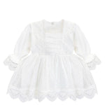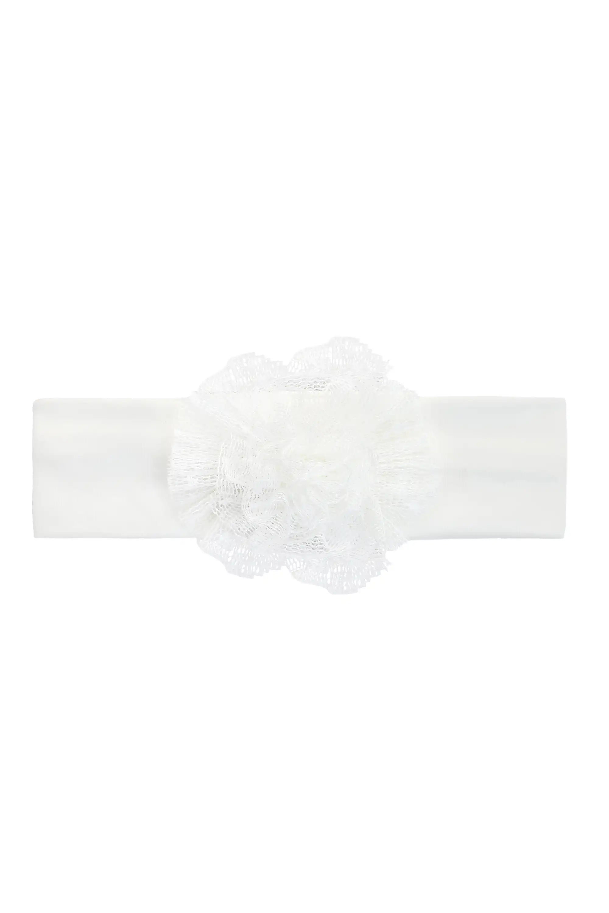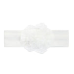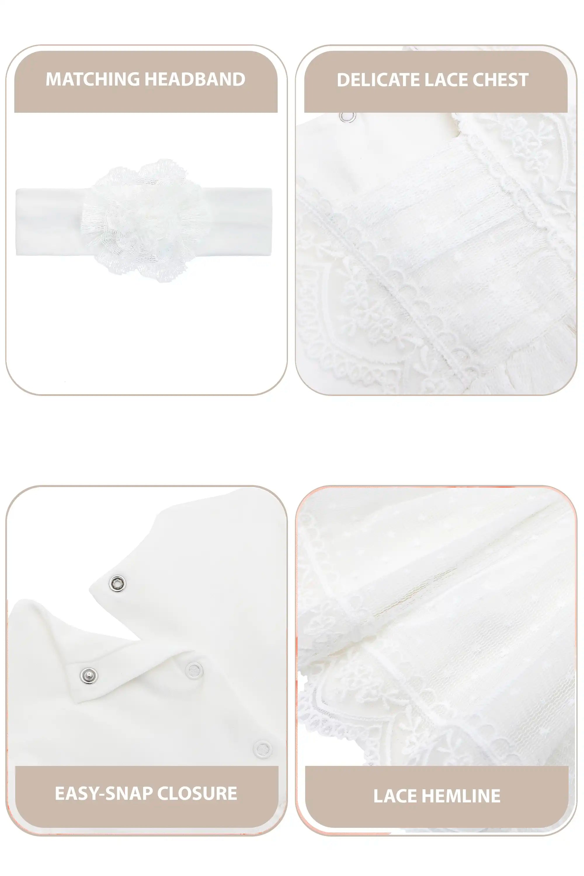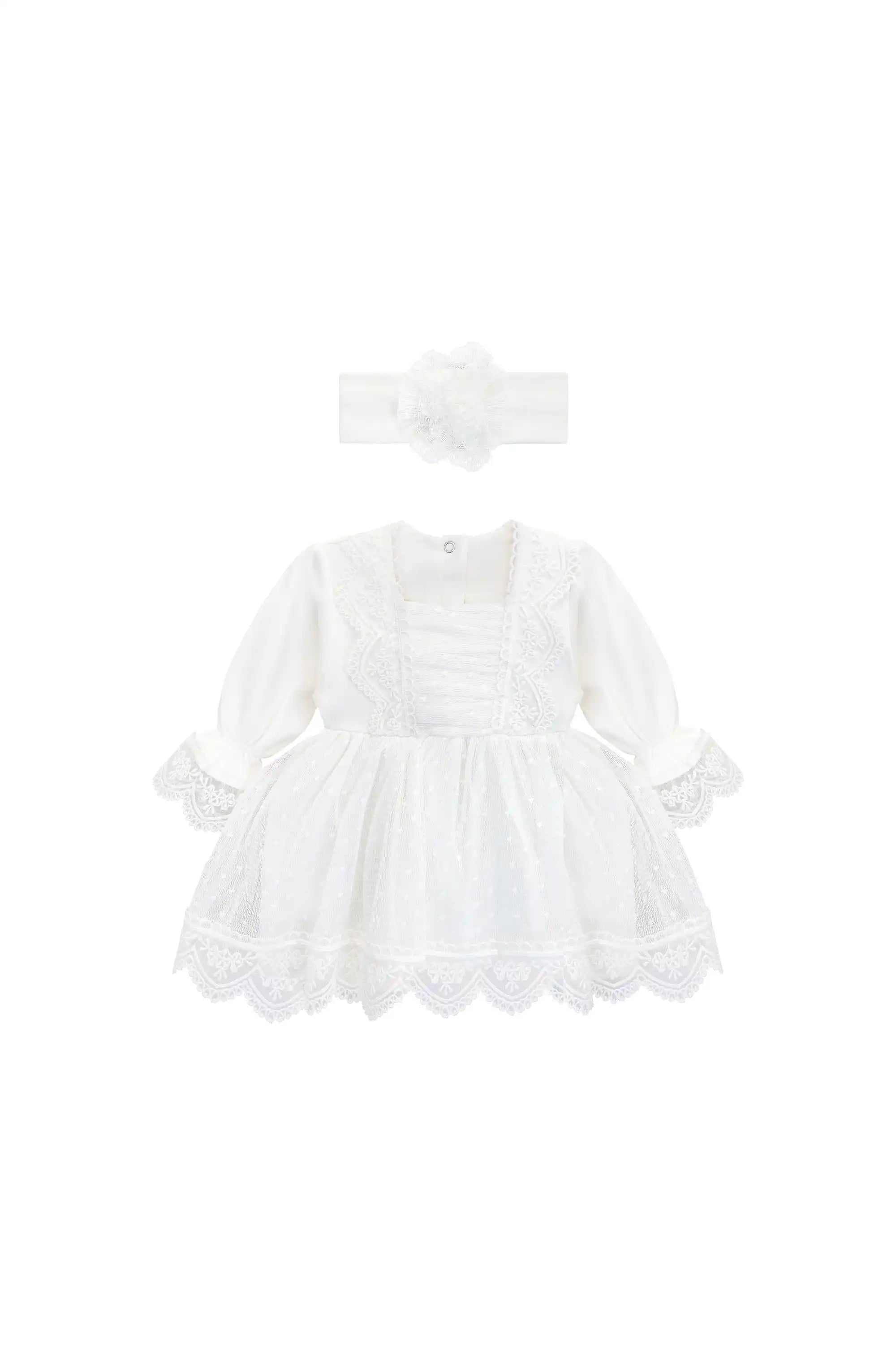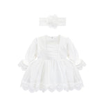 • Elegant baby girl dress set featuring a delicate lace dress and matching floral headband